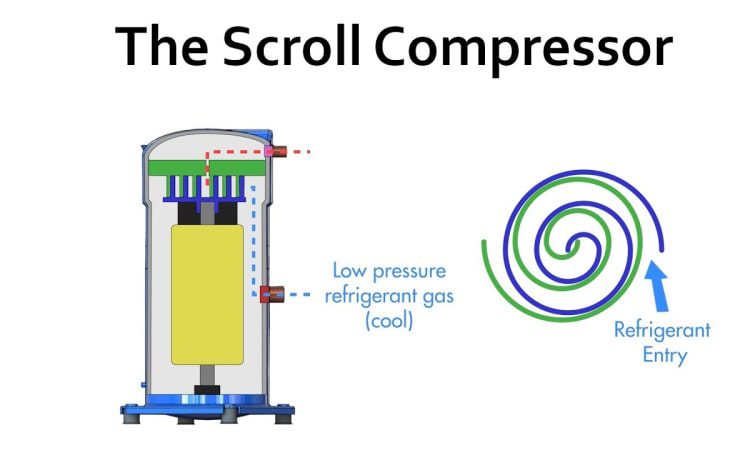 در این مدل، دو مارپیچ حلزونی درون هم قرار دارند که یکی ثابت و دیگری متحرک است. با حرکت مارپیچ متحرک، گاز مبرد به تدریج به سمت مرکز فشرده میشود.